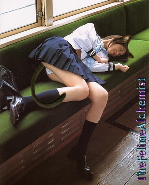 This reminds me of one of my favorite morphs by silverfish forever ago! The calico catgirl lying on the ground