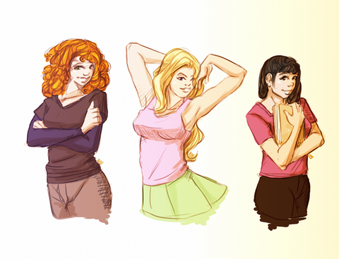 You should make a short comic about these three characters, maybe a few panels long. They look like they'd be fun to read about.