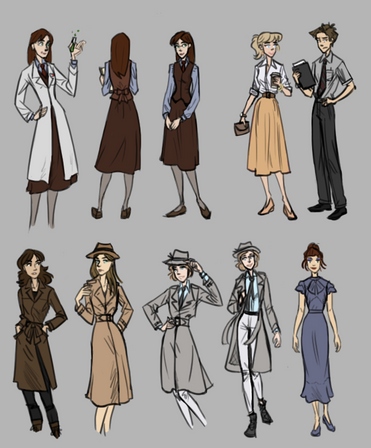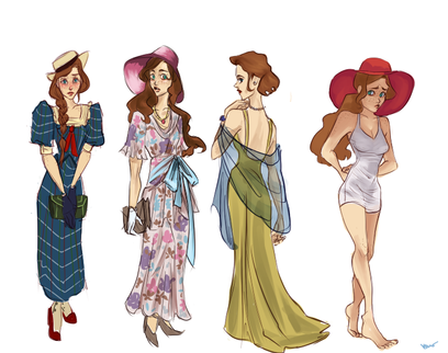 My favorite designs from the page are the right-most ones that show off her coat. Her dress moves so well in the one with her back to us.