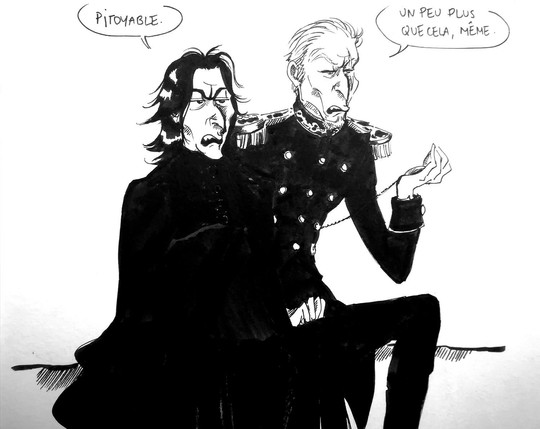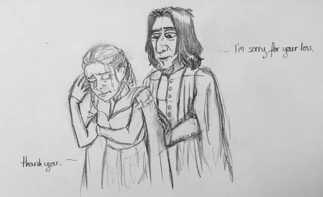 Tes illustrations du septième tome sont toutes aussi touchantes les unes que les autres. Le noir et blanc rend très bien ici, il rappelle le contraste entre les deux personnages, et l'accablement bien sûr. C'est d'autant plus frappant. Le regard fuyant de Dumbledore est aussi communicatif que le désespoir de Snape.