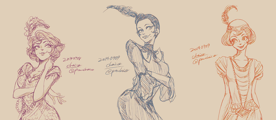 Je suis une grosse fan de Mucha et des fringues rétro, Gaga c'est une autre histoire mais ton trait est vraiment sympa et j'adore les poses que tu a choisi. Mes préférences sont pour les 2 du milieu ^^
