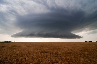 This is a part of the same supercell thunderstorm I photographed here, but taken several miles east: [link]This picture was taken in western Oklahoma, somewhat under the band of warm, moist air flowing into the the heart of the storm. I parked on the side of the road and scampered into the adjacent wheat field. In this picture you can see how the air is beginning to wrap counter clockwise into the area where the wall cloud has formed and where the moist air is spiraling upward. The column of rain that you see is caused by the moist air spiraling upward and condensing into droplets and/or hail and then falling back to the surface. You cannot see the lowering wall cloud since it is on the other side of the column of rain, but a picture of the actual wall cloud will be coming soon!