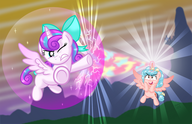 Have the story be Shining Armor getting possesed by Discord, throw in some sibling battle music (my personal choice is Under Heaven Distruction from BlazBrony- er BlazBlue: [link] ), and you've got a wicked idea for a unicorn battle.