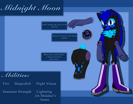 Personality: Don't be fooled by his serious demeanor; Midnight is actually quite cheery most of the time and can be quite sarcastic. He is fiercely loyal and his sense of goodwill often leads to him being taken advantage of. Always curious, Mid is always looking for an adventure. He doesn't like to mention his past except to Faith and his closest friends. He can be a worry-wart sometimes and thinks about all the things that could go wrong with a plan. He's very straightforward and to the point. This makes it look like he lacks a sense of humor.