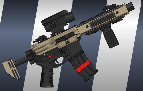 The CL-H22 assault rifle is a combative, single caliber design, with an orange carbon-aluminum blended alloy upper receiver and polymer lower receiver / fire control unit. The weapon is gas-operated and features a rotating bolt and a manual gas regulator for automatic fire. The fire control unit includes ambidextrous safety/fire selector switches which can be found on both sides, which permits semi-automatic, 3-round burst fire and full automatic fire, all at the flick of the switch. The charging handle is on the right side only, making it less ambidextrous for those both left and right handed. Magpul created variants of their PMAG magazine systems, in which the magazine sports the traditional CL ring for easier magazine ejection. This ring has no effect in magazine size however as always.