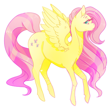 Fluttershy in my style, and my second favorite of the Mane Six.I imagine her to be a rather scrawny equine, with narrow wings like a swallow. She would be tall, but dainty, with thin legs and wide hooves. I curled her mane at the ends; she just looks better with curls than straight mane/tail in my opinion.