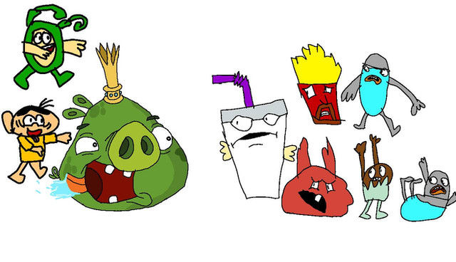 Next up, AQUA TEEN HUNGER FORCE. The show was okayz and I HEARD IT WAS FUNNY/AWESOME. My favorite Characters on Aqua Teen Hunger Force are Meatwad and Master Shake CAUSE THEY SERIOUSLY NEED TO BE AWESOME. Meatwad CAN TRANSFORM TO ANYTHING while Master Shake TAKES A MILLION YEARS TO WALK. (I'm just saying.