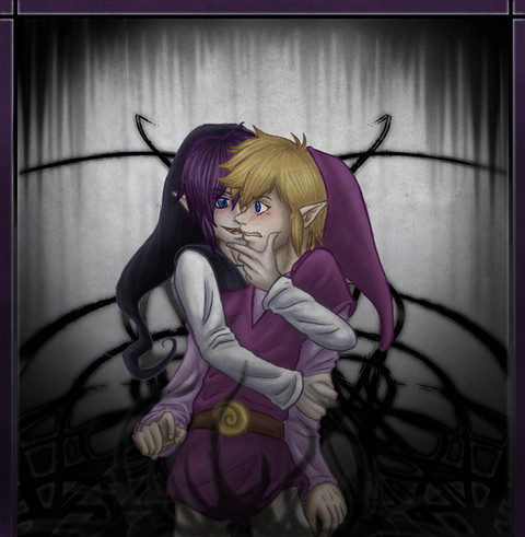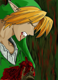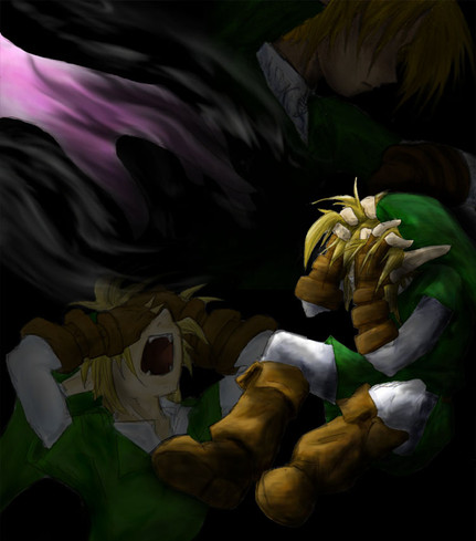 I know people have been arguing back and forth about this, but I really like the eyeless Link for this piece. It keeps it abstact, so it takes a minute for the full image to register. I think a pair of big bright anime eyes would detract from that. Awesome picture, awesome subject matter! Huzzah! XD