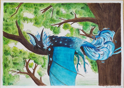 A green forest suits well to the blue of her :3 And I love painting forests <3 They're much fun to draw.