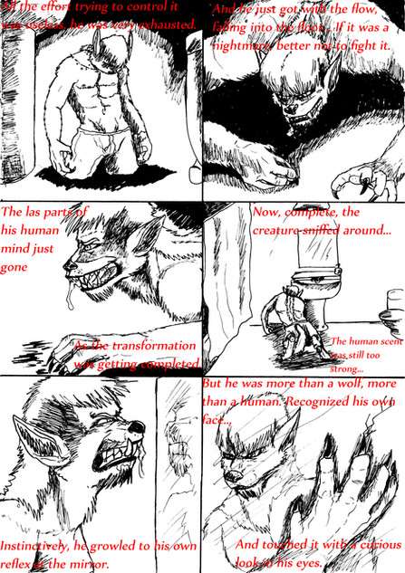 An artwork of my main OC Allen going through his excruciating lycanthrope transformation in the forest as the moon shines brightly on his growing brown fur.From HOWL