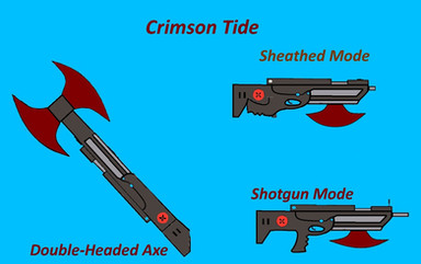 Her weapon is named "Crimson Tides" and its a combination of a Double-headed Axe and a fully automatic Shotgun. This Weapon is excellent for Short-Mid Range, but sucks really bad at Long-Range. She made it at Signal, since all students there are required to make their own weapons. She can use normal Shotgun Ammo or the Dust variant, Explosive Ammo for more Damage.