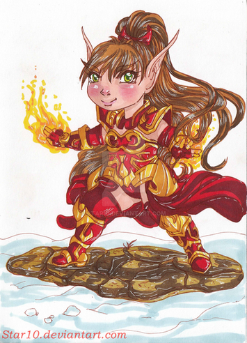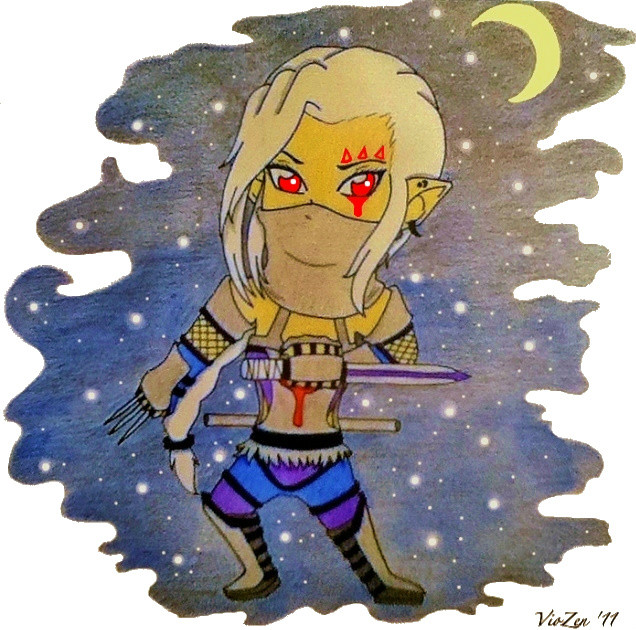 My Night Elf Hunter, Kihaku, with her fox, Ninjara. :3Was drawn on a sheet of paper with a bunch of other useless crap on it, so I cut it out a while ago, and lacking a scanner, that's the top of my dresser you see there.