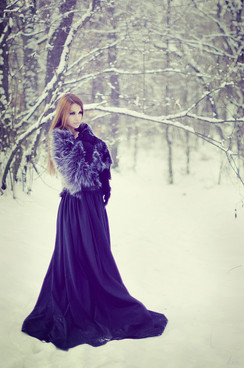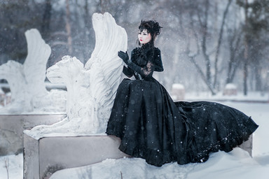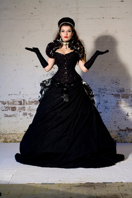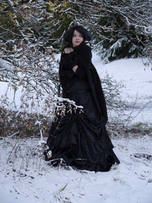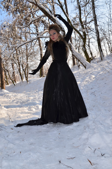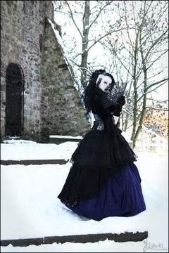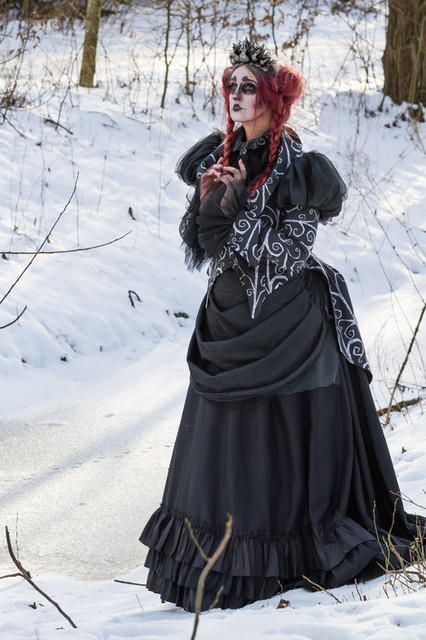 Ich glaube, du musst niemanden töten… Die Jacke, die sie anhat kannst du ganz normal kaufen. Der Reifrock ist zwar vom Modell selbstgenäht, aber nicht original, ich hab ihn in Photoshop länger gemacht und ihr die 30 Meter Tüll beim Shooting nur lose drum drapiert…