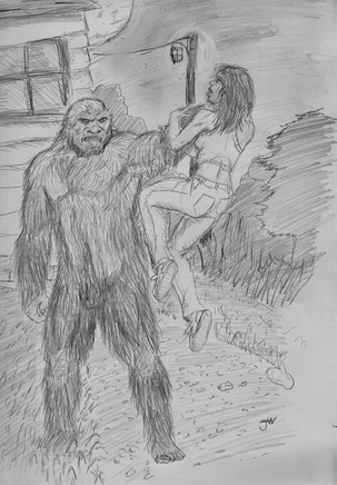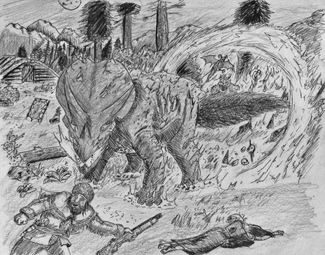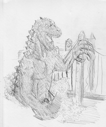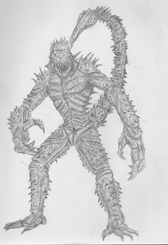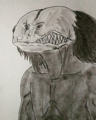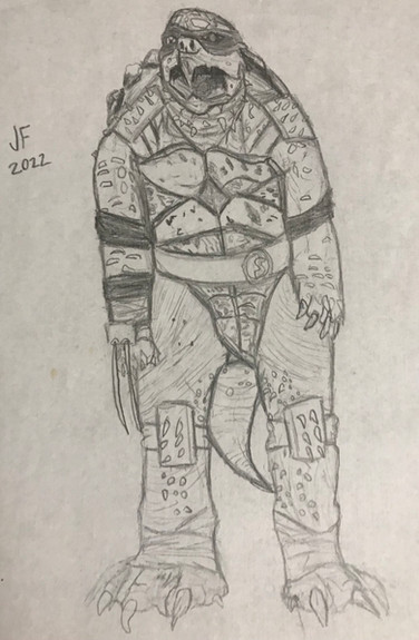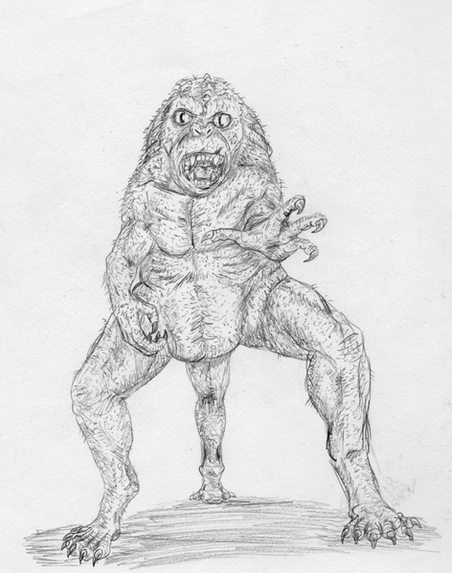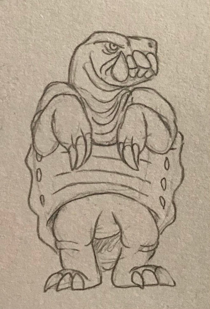 When I drew this up, I wanted it to look both frightening and like a flesh and blood critter, so I basically envisioned a bipedal alligator snapping turtle with some primate features.