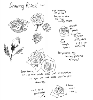 I was inspired to remake a tutorial someone wanted me to make on how I draw roses. Last time was just hand drawn. It is still hand drawn now because I wanted to give that personal touch to it, so do excuse my handwriting if it is not to your liking.