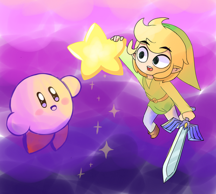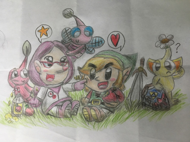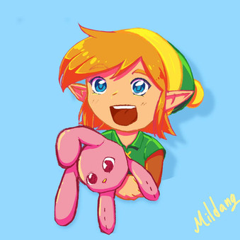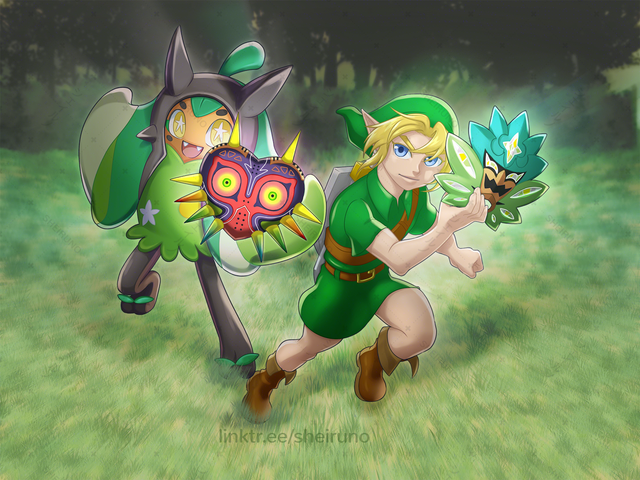 I made a digital art of Link’s Awakening Link (I like to call him Toy Link btw) and Pawmi from Pokémon having a healthy snack, together!