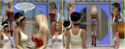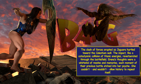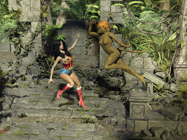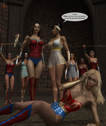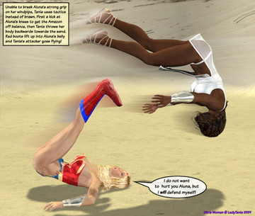 Awesome, Tania! The Aztec Princess is stunning and emanates with power! The image is very powerful and sexy; Ultra Woman always looks soooo sexy in defeat, but especially so when its to another woman! What a punch! It feels as if Our Girl really is tumbling head over heels through the air, knocked cold by her beautiful foe! I would have liked to have seen more of the fight, and yes, tears to Ultra Womans costume would have added "realism" but we're not here for that, are we? Mind you, subtle tears in the right places, a glimpse of Amazon breast and bruised flesh is always welcome, lol! Id like to see a pic of Ultra Womans stunned, and stunning, lol, body being washed out to sea; I love your pics of her wet suits and bikinis, but I dont think we've had a "wet t shirt" type pic before, lol! Thank you Tania for sharing your wonderful imagination and talents with us!