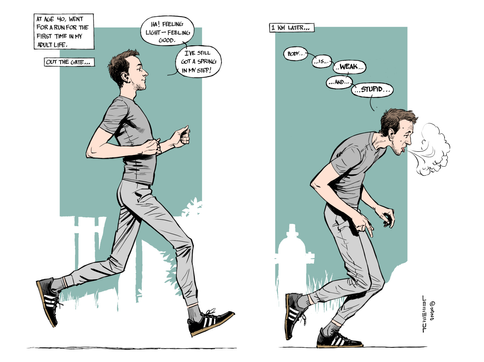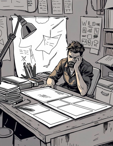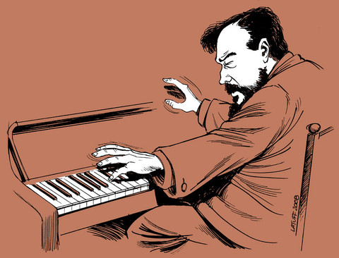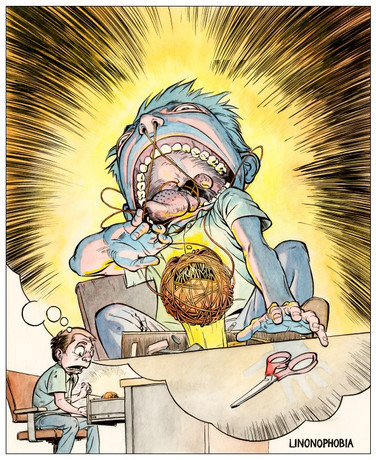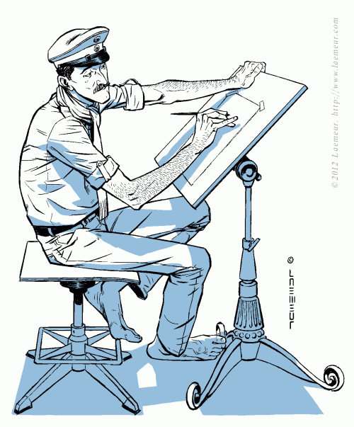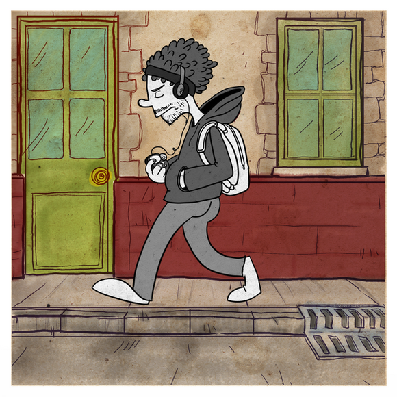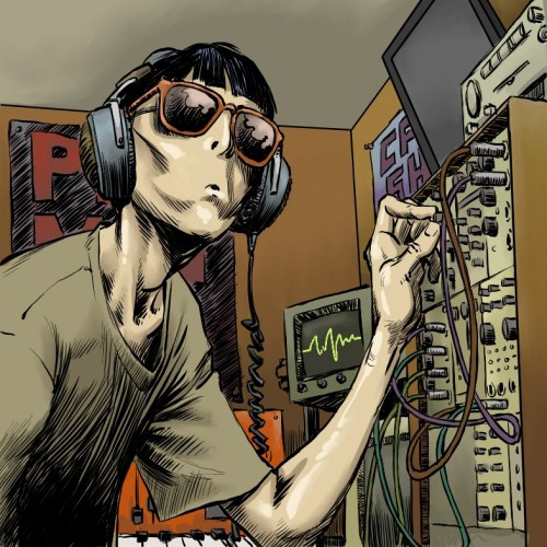 Laemeur puttin' a track through the machines. Site art for the Fmod page on Apocalyptek.Linework is ink on paper, colors in PSP.