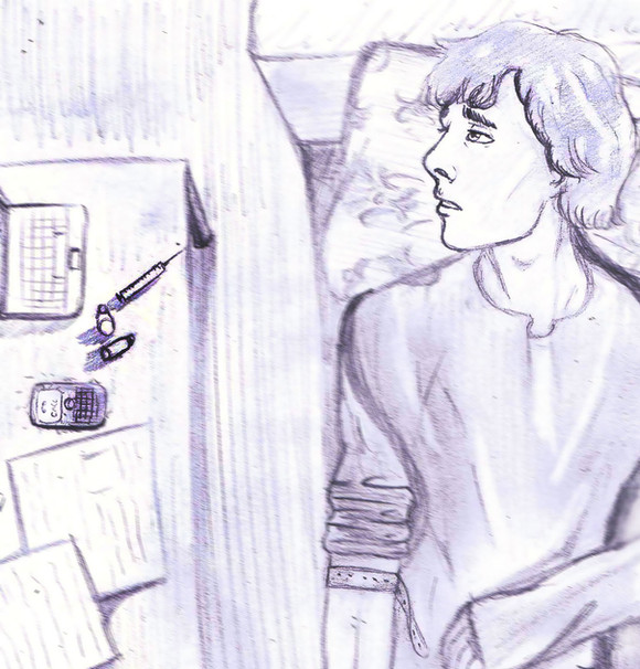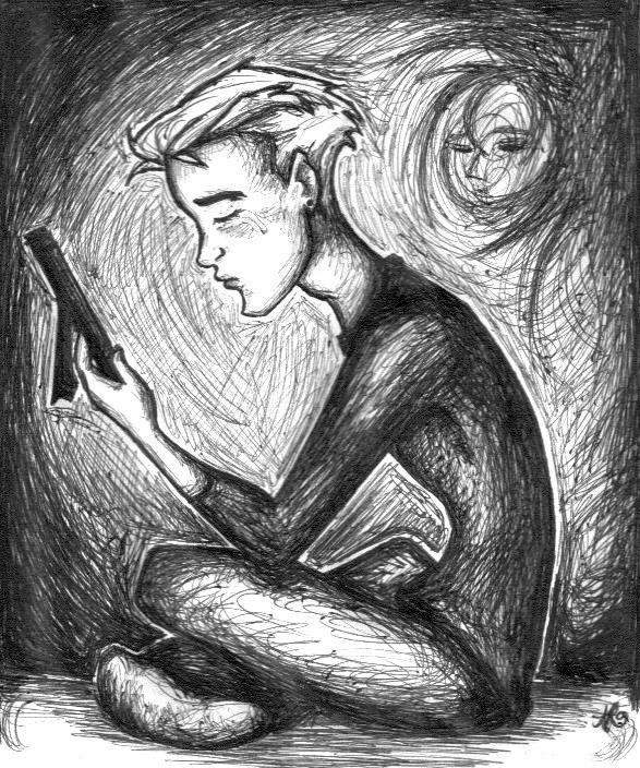"Long hair is great for hiding behind, when you don't want people to see you." That's how I see it too! He is so insecure I just want to hug him. Beautiful drawing