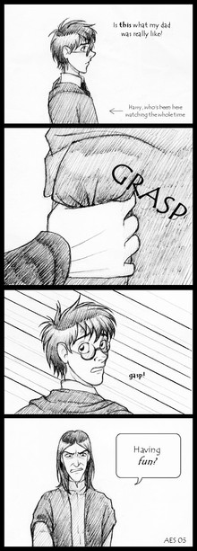 I've always been fascinated by how alike they are, but Snape lacks any emotional growth in the books - even when he gets to know Harry and should feel some kinship to him, he just keeps hating him for his appearance that is so like James'. Harry has a real moment of insight here, I wish Snape could have been that cool. Loved this strip by the way, its a favorite of mine