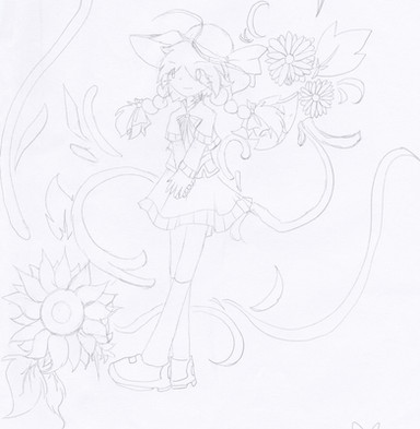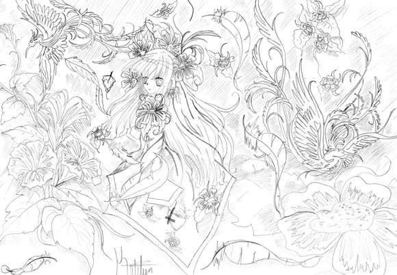 Tu y es enfin arrivée à faire le lineart avec des différents fleurs pour chaque personnage, bravo ! x") En plus, j'adore vraiment où tu leur as fait les tenues avec les fleurs, tu le sais hein x"3 J'y hâte de voir la couleur, tu vas y arriver donc tiens bon, courage ! D": *te fait pleins de câlins et surtout masser ta main gauche* ça va aller, tu vas y arriver ! ♥