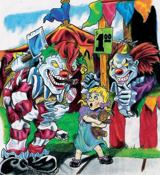 clowns... *shudders* im not afraid of them, but theyre friggin weird. and you should see gothic-clowns, holy CRAP those people are screwed in the head XDDD