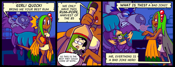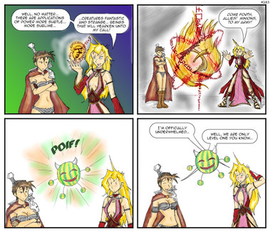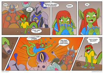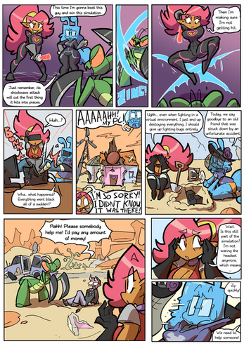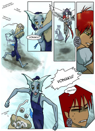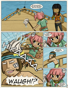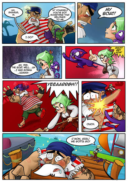 And the frog-announcer! He's awesome! XD I love these colorful character designs. I love how in a piratey world, the announcer and fight promoter is a frog in a peppermint-striped, county-fair huckster shirt. XD And, looking forward a couple of pages on the official site, I can see all of the characters are just as colorful and quirky. The character designs and the mechanics of the world really work for me -- they're fun and colorful and engaging. Everything feels exciting, and it draws you into the story more, I think.