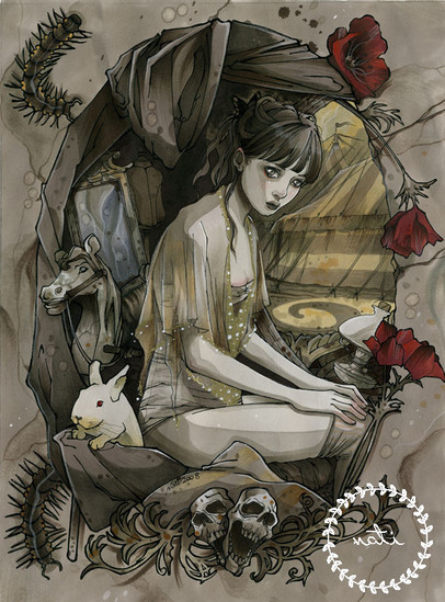 Lovely colours and flow to her hair. The outfit is quirky. I dig the bats and circus, too.
