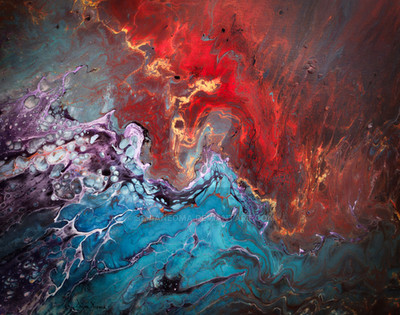 This is an abstract acrylic pour using a dirty pour method with red, bright blue, light blue, gold, and green acrylics on an 11 x 14 canvasRelated content
