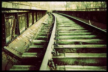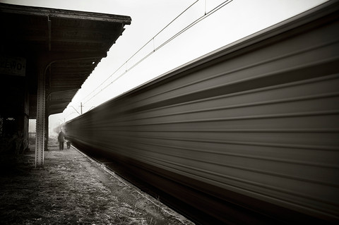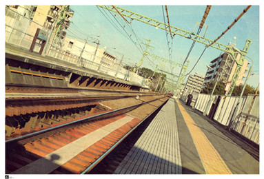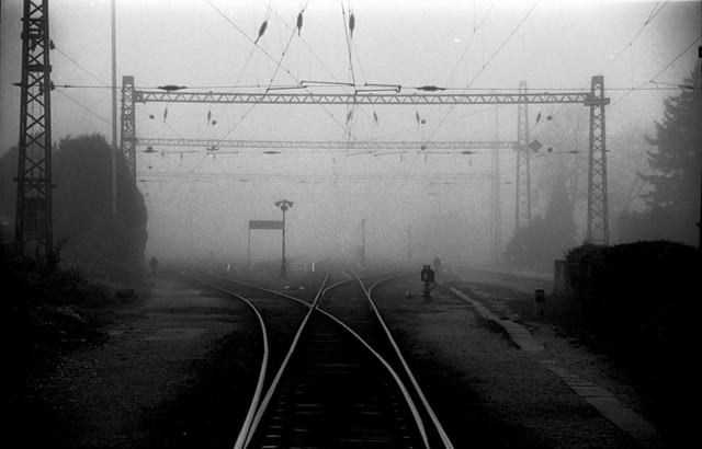 Great shot! Lucky, lucky timing. The composition is very nice: the lines of the tracks draw your eye to the person crossing. Excellent work.