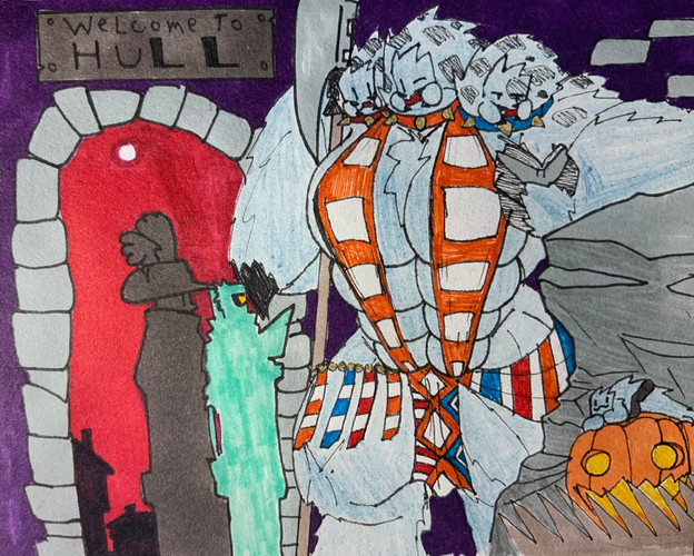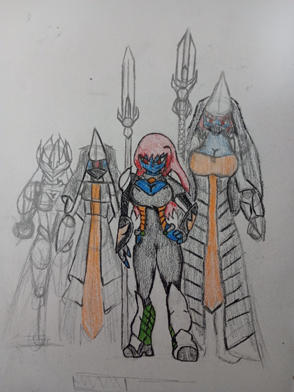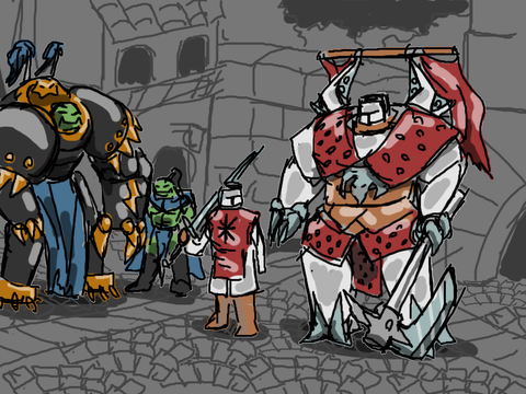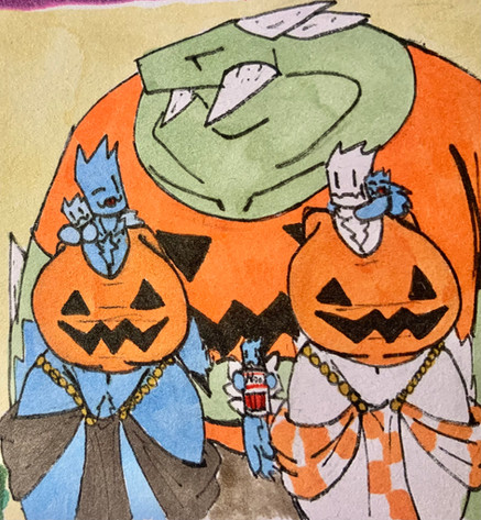 #traditionalart #alien #armour #axe #chainmail #critter #fantasy #floofy #fluffy #gem #gemstone #guard #human #loincloth #medievalfantasy #multiboob #musket #night #pumpkinhalloween #spear #threeheaded #multiplebreasts #sizedifference #alcoholmarkers #largerfemale #gambson