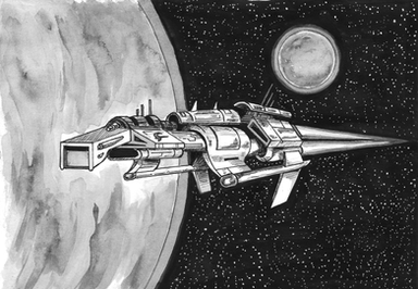 An Antique United States Exo-Solar Colonies Patrol cruiser in low orbit above a asteroid moonRelated content