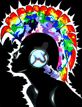I love your use of colours! It's bright but not too much for the eyes, and they flow into each other really well. There's so much going on to keep us interested and looking around, and the shapes move into each other very nicely. My favourite parts are the dripping pink paint, the green fading into yellow in the upper right corner, her hair and feathers, and the colours on her neck. This is awesome, keep up the fantastic work!