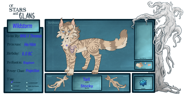 Brief Description : A tom slightly taller than average with dust looking fur, with sharp blue eyes.