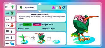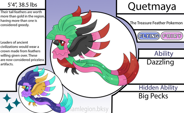 "Quetzit have colorful plumage and were revered long ago by an ancient civilization. In ancient times they were captured to harvest their tail feathers for headdresses, then released back into the wild."Quetzit evolves into Quetzalot.