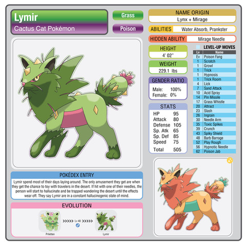 "Envokit use their whiskers to cast a variety of energy/based attacks. They can be cocky and tend to taunt in battle, often leading to mishaps where they accidentally allow enemy attacks to hit them."Envokit evolves from Charmew. Envokit evolves into Enchancat.