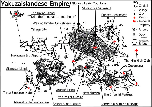 Three Emperors Resort, Yakuza Isle, TIKI FM, the Fujimotos, the concept and drawing made by me