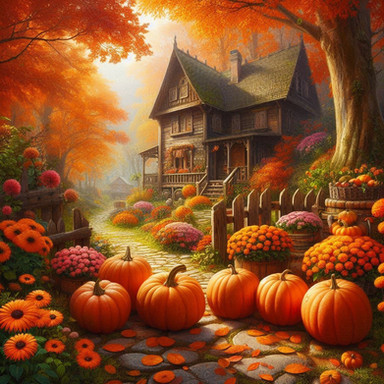 #autumn #fallfoliage #fallseason #forest #forestlandscape #forestpath #logcabin #orangeleaves #pumpkins #seasonalart #warmcolors #woodencabin #naturescenery #rustichouse #autumnart #tranquilsetting #peacefulforest #countrysidescene #autumnvibes #cozyautumn #cozycottage