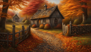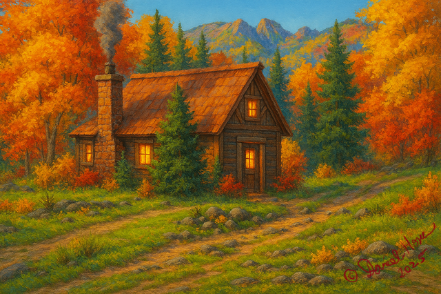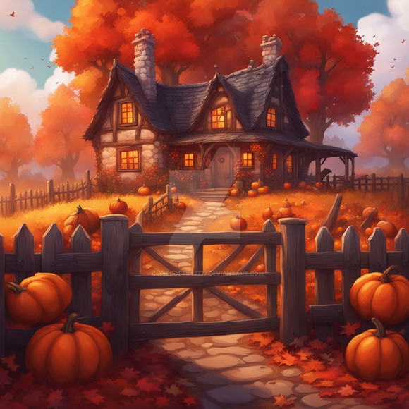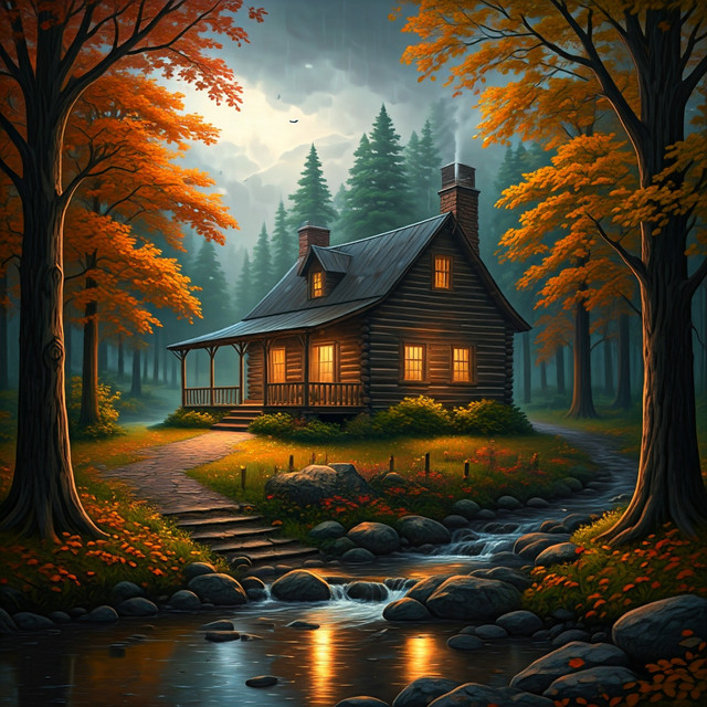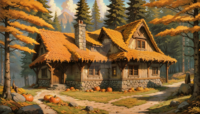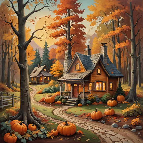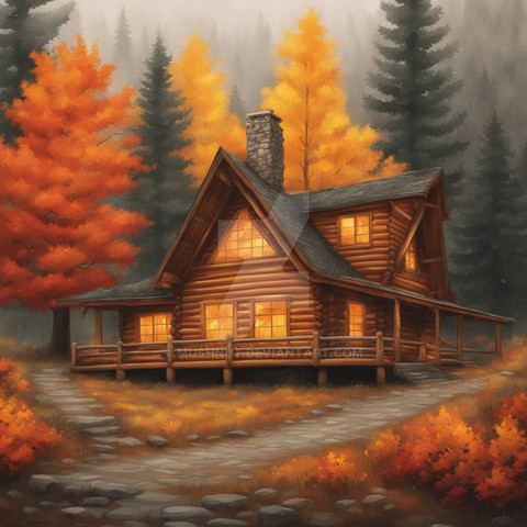 #digitalart #forest #autumn #fallfoliage #fallseason #forestlandscape #forestpath #logcabin #orangeleaves #pumpkins #seasonalart #warmcolors #woodencabin #naturescenery #rustichouse #autumnart #tranquilsetting #peacefulforest #countrysidescene #autumnvibes #cozyautumn #cozycottage
