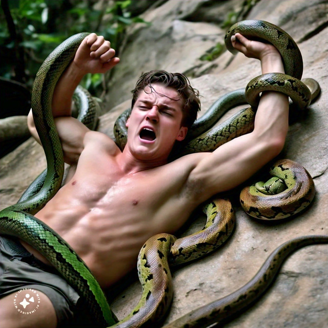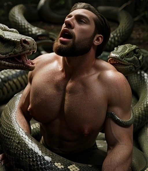 I would suck those pecs and then massage them while I kissed him. I would suck on the snakes snout too for letting me watch such a sexy scene. The snake would like my attention and relax a bit more so I can suck his tail and drink his cum. ask him to be merciful if I agree to suck and let him fuck me with that tail. He releases this guy just so he can wrap us both and we begin to enjoy the snake instead of fearing. We moan I love you to the snake and kiss him and suck his snout. He likes that so much he fucks us and we share suck his tail while he squeezes so tight around our hips that we and the snake cum.