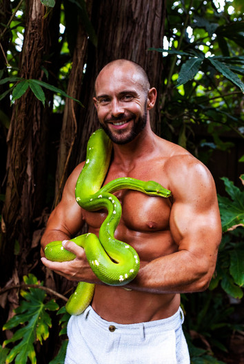 His eyes sho content he is to have those coils around him.Handsome by beautiful snake.