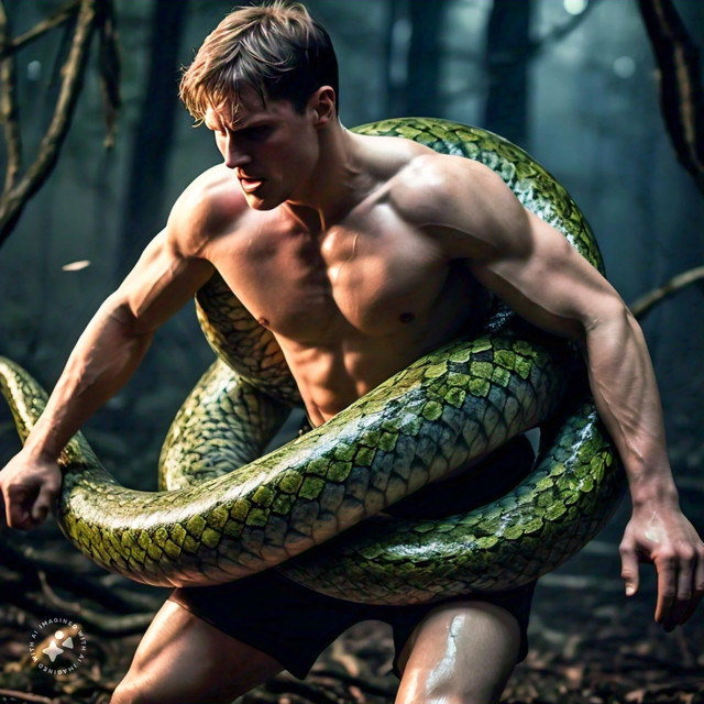They should would both win if love making was part of the squeezing. The hunk would look and feel so sexy with those coils around him. The snake would love the feeling of holding the man's body. The squeeze is tight and pleasurable for both.