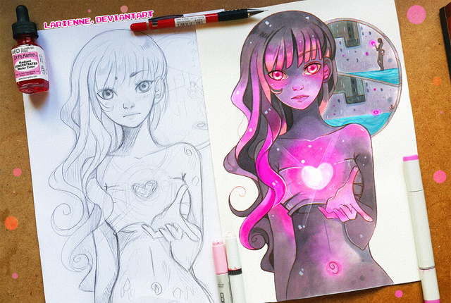 "She picked up the mirror to see herself just this one more time. But as she took a look, her face wasn't there - instead, she saw the endless cosmos of stars. No matter how hard she tried, she couldn't find her own self anymore, she lost herself forever. She could be someone special, like the Moon - instead she became one of many nameless stars." No matter what guys always try to be yourself. Stars are pretty but deceptive, always strive to be the Moon."Eh I drew it with a personal message behind it but the more I think about it the more pointless it seems to say. In the end it was a nice practice of different angle again
