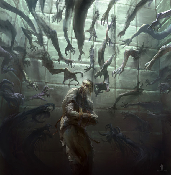 "When day became night, the chaos would take hold once more.It was as though he had been isolated from the outside world for years, rather than days. He had almost forgotten what it was like to taste, to touch, even to breath. He carved his new, nightmarish designs into the wooden floor with his own fingernails until they were torn away, his hands splintered and worn down to the bone. Dipped in his own blood, he had pulled the tiny splints away to execute the finer details. Surrounded by more drawings on paper and frantic notes, his concepts were both an effort to make sense of the voices and the ideas presented to him. They were blue prints, no – 'red prints' for a dystopian nightmare.