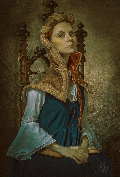 I love all the little details you put in. From the gold of her dress, the subtle lines in her sleeve with the translucent rifle at her neckline to her lovely face. Really smooth. The pallet is also really nice. Thanks for posting your artwork and sharing it with us.