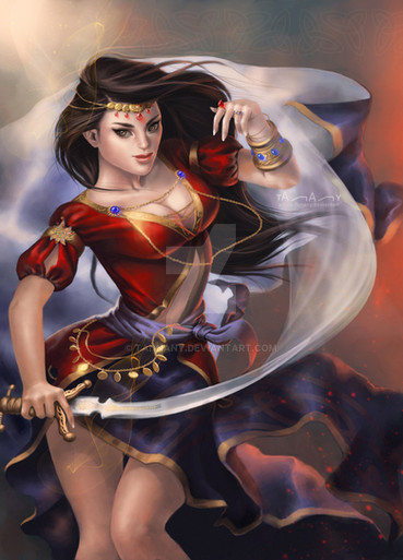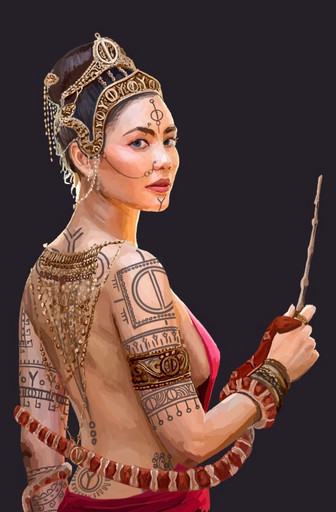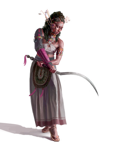 She is wielding a dagger called "kris", an asymmetrical dagger with distinctive blade-patterning achieved through alternating laminations of iron and nickelous iron. This ancient Filipino/Southeastern Asia weapon is famous for its unique wavy blade.