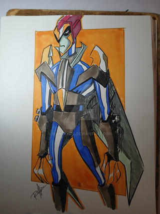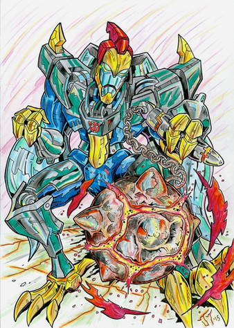 I wanted to give him a bit more personality and expression (a face) then he was given in the comics so I mixed cues from his war for Cybertron designs with that of Generation 1 influences. I also referanced predacons from Transformers Primes Beast Hunters to come up with a original concept.
