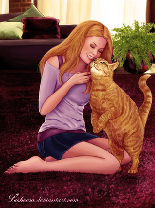 Love the tenderness, as well as their mirrored positions. Β It is SUCH a cat pose. Β Her hair is beautiful the way it flows, and her toes as they curl into the cushion.