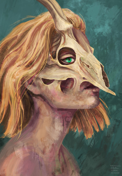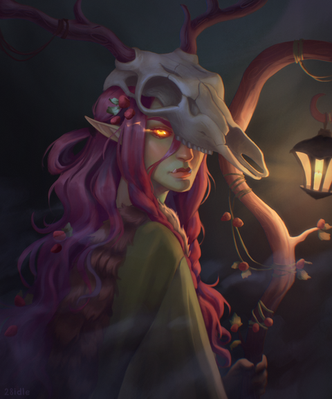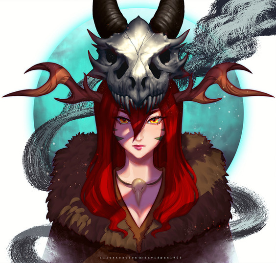 #bone #characterdesign #cute #digitalart #drawing #elf #emerald #fantasy #femalecharacter #girl #glowing #greeneyes #horns #illustration #leather #mask #metal #painting #photoshop #portrait #redhair #shaman #skull #smile #stripes #witch #looking_at_viewer