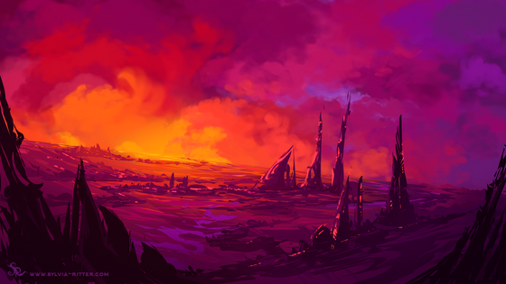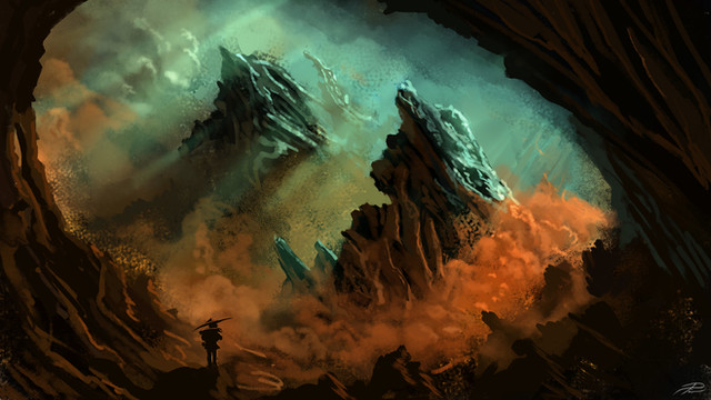 #adventure #atmospheric #clouds #conceptart #desert #digitalart #drawing #environment #fantasy #glowing #illustration #landscape #mountains #painting #rocks #scenery #speedpainting #spikes